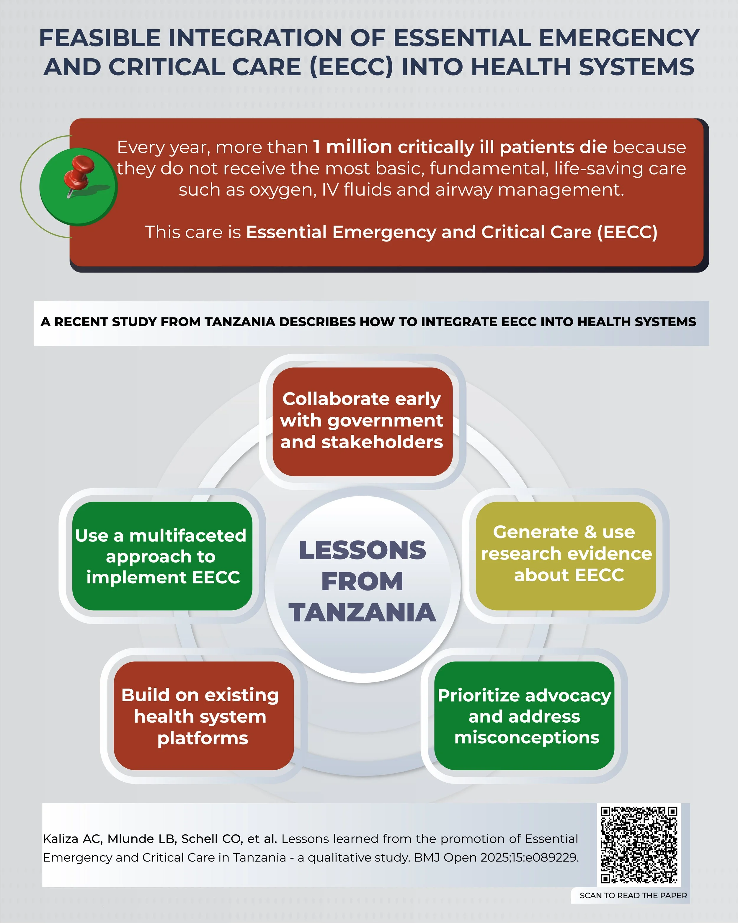 As the global health community increasingly recognises the urgent need to improve the care of critically ill patients, Tanzania has emerged as the first country to embed Essential Emergency and Critical Care (EECC) in national policy. A new qualitative study published in BMJ Open offers rare, practical insight into how this happened, and what other countries can learn from the process. Drawing on interviews with policymakers, clinicians, researchers and implementation partners, the study distils the steps, strategies and system conditions that enabled Tanzania to move from early discussions of EECC to coordinated national action.